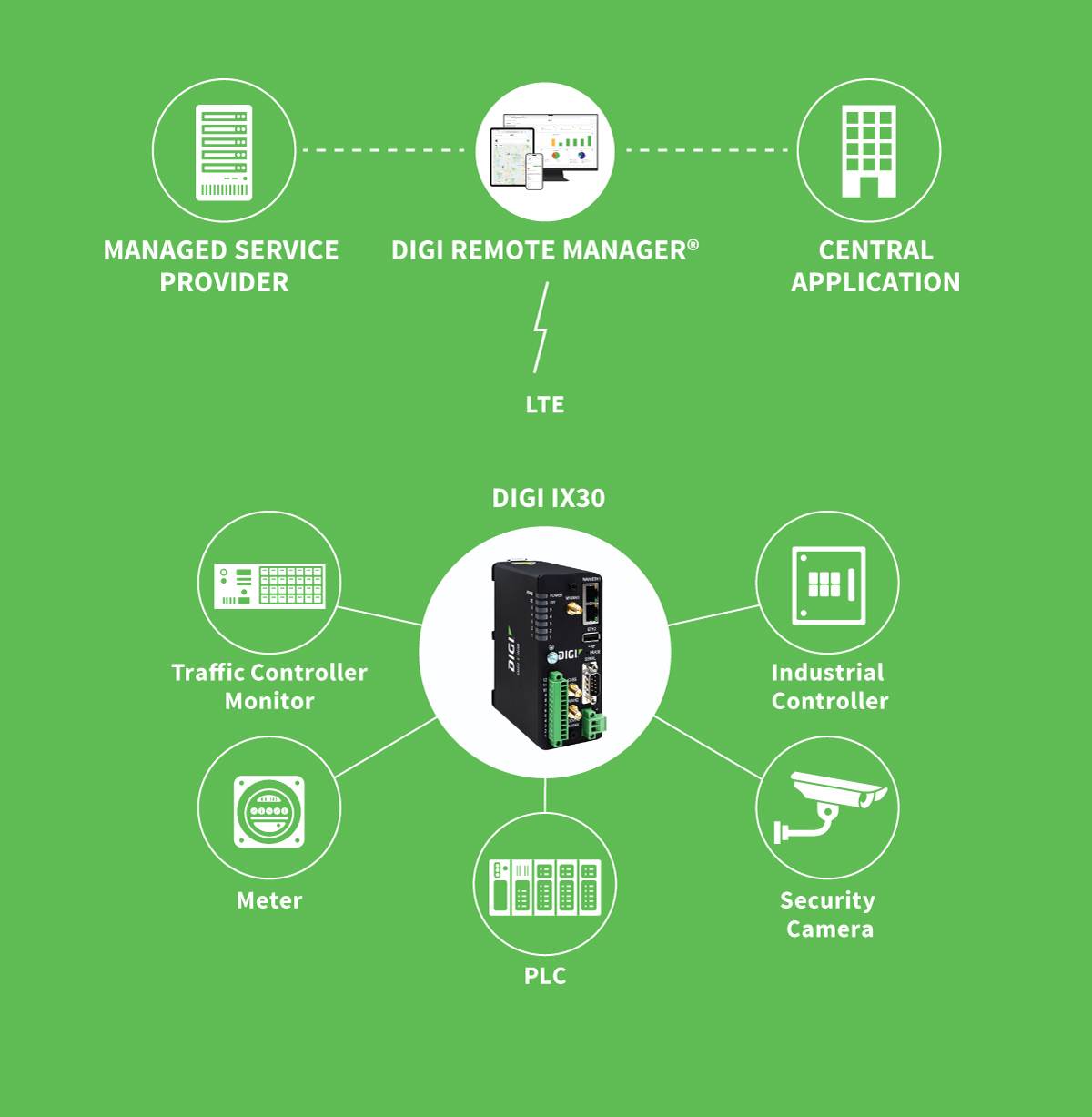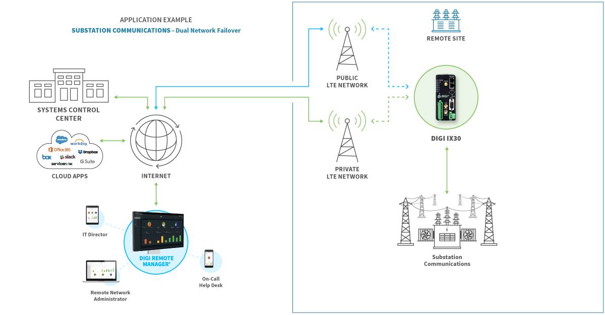 Digi IX30 is an intelligent 4G LTE router designed for optimal performance and reliability across a wide range of critical infrastructure and industrial applications. This complete solution is fully integrated with software and security, providing a secure, reliable connection to industrial controllers, process automation equipment and smart grid assets on third party sites or remote locations — easy to deploy and centrally managed via Digi Remote Manager (Digi RM), which is included in your Digi 360 solution.