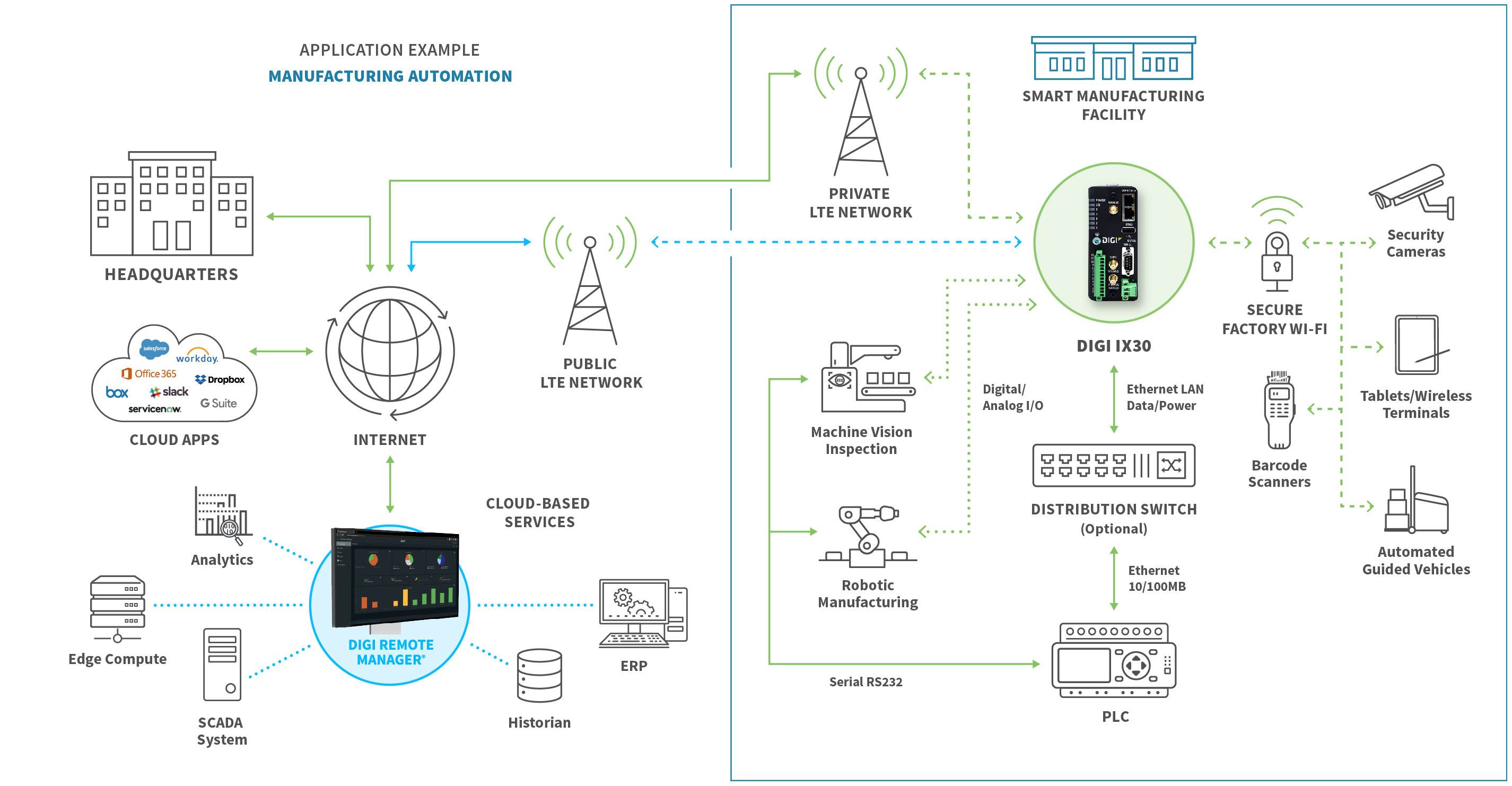 Digi IX30 provides substantial capabilities for real-time data processing, edge computing and advanced precision. Digi Containers facilitate cost-effective applications, providing additional flexibility and scalability for industrial uses and private LTE deployments.