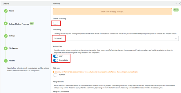 5. In the automation, click on enable scanning and select Manual as frequency, so that it is manually started only in case of need. For the action plan,” alerts” will give just a warning that the scanned device is not in compliance with the template settings, instead “remediate” will also effectively change the not compliant settings, so last one should be selected to act similar the “Restore” of the WEB UI: