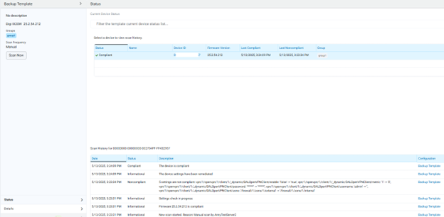 6. Once the above template is created, it will be like a “backup file” that can be “restored” by enabling it and running a manual scan on a device. The scanned device can be the same device from which the settings have been taken (example: a reset or non wanted changes have been done on it) or another one (example: original device is faulty and a replacement is needed):