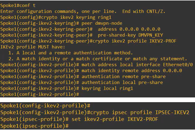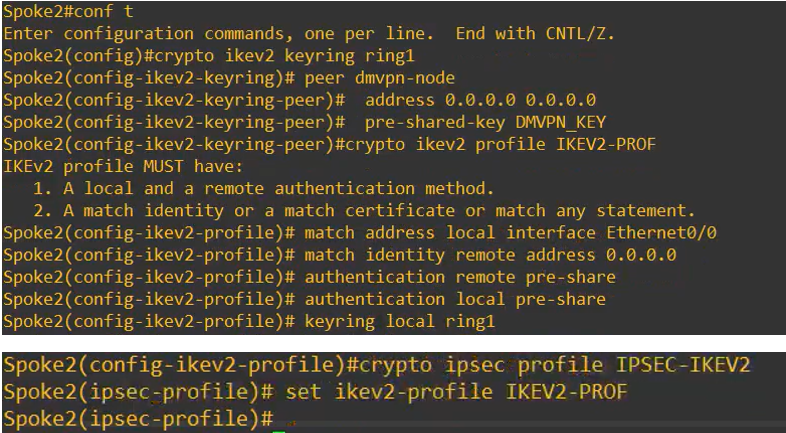 On each Spoke, enter configuration mode and use the following commands to define the IKEv2 keyring and the IKEv2 profile.