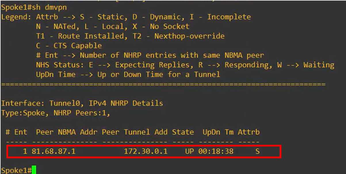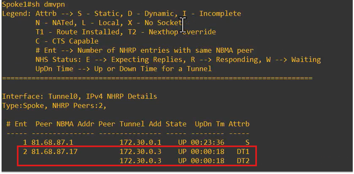 This shows that A second peer entry appeared, indicating that a direct tunnel between Spoke 1 and Spoke 2 was dynamically established.