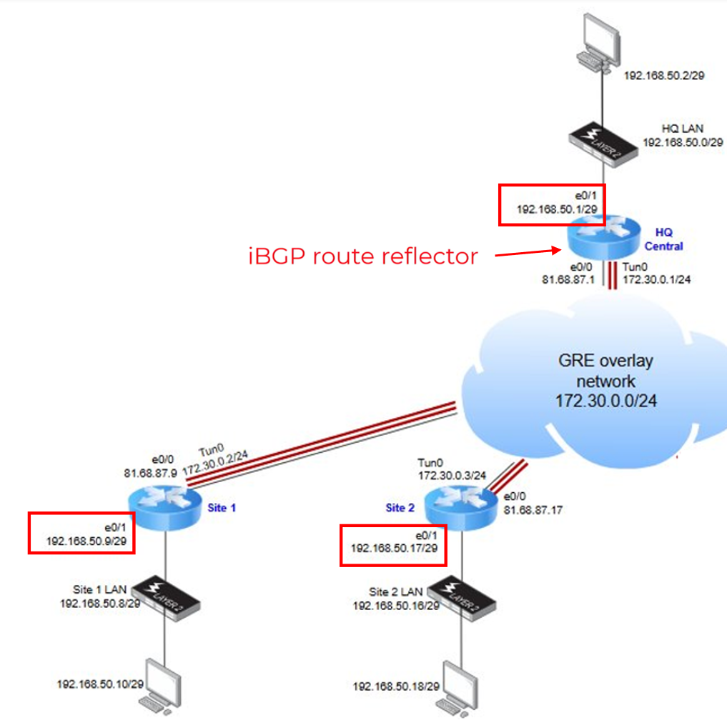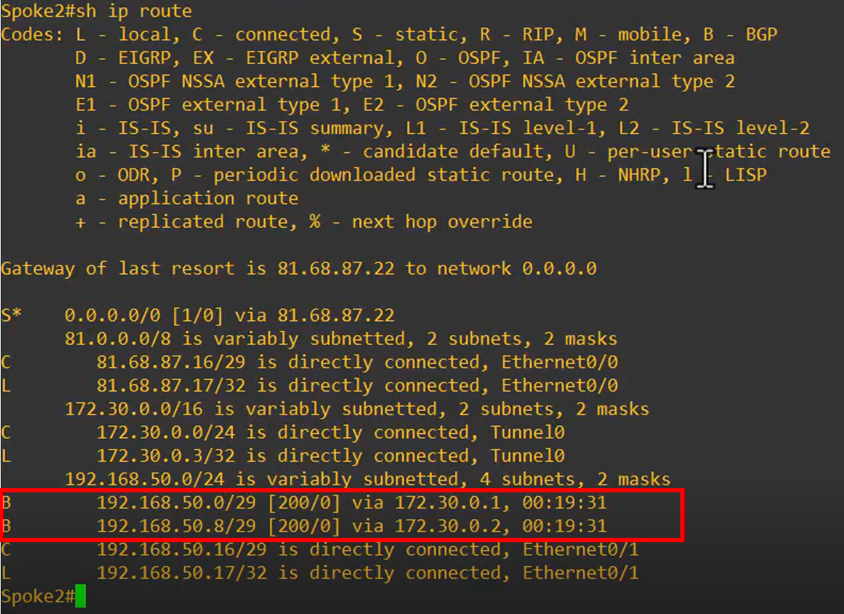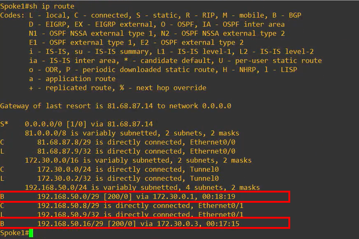 - Note: Each Spoke receives the LAN of the other Spoke via the HUB, which acts as an iBGP Route Reflector, redistributing routes between Spoke 1 and Spoke 2.