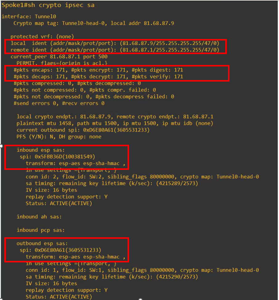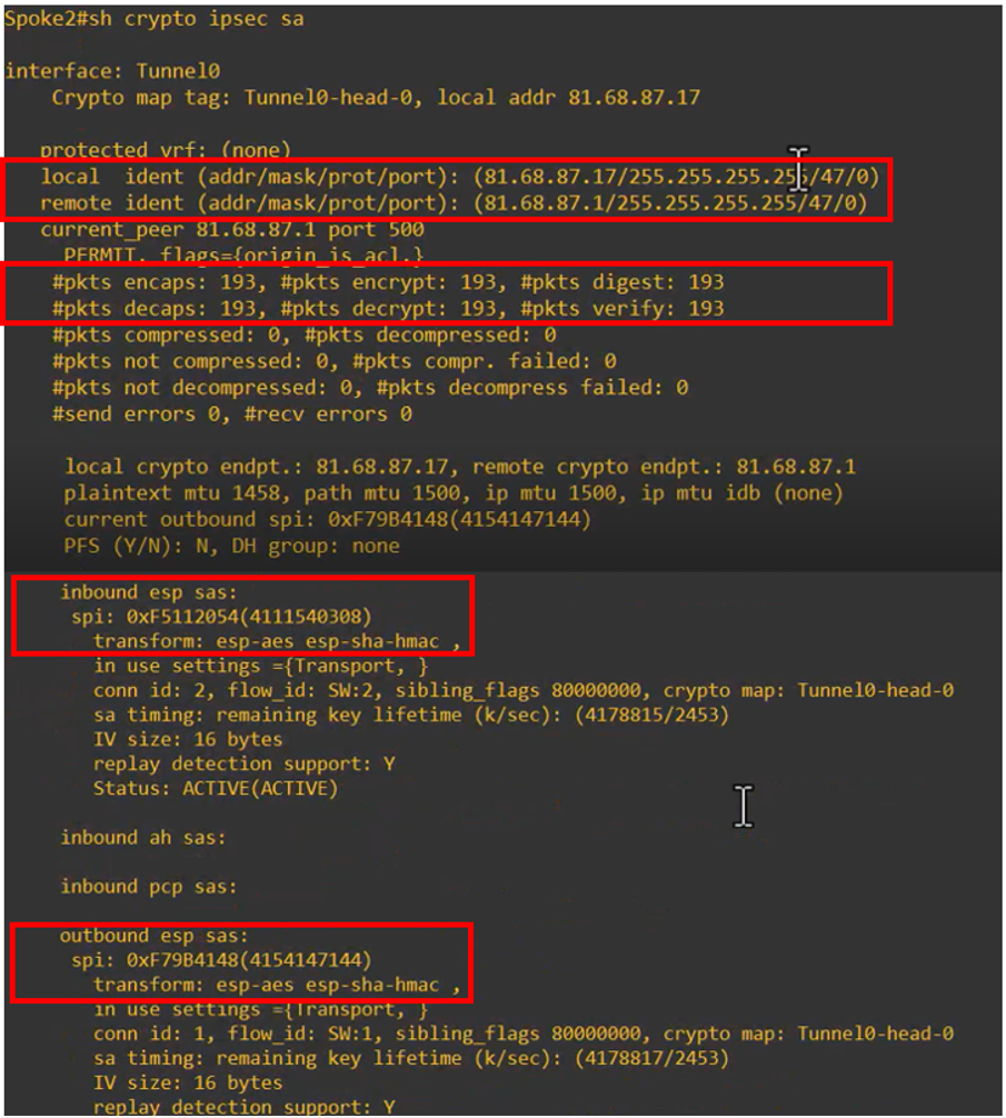 Further down in the output, a second SA is displayed, corresponding to the tunnel established with Spoke 1: