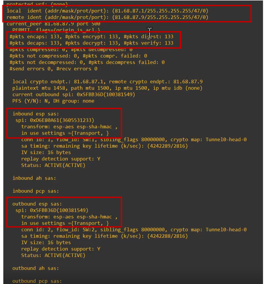 - Transform Set: The negotiated transform set matches the configured parameters, ensuring the use of expected encryption and integrity algorithms (e.g., AES for encryption, SHA for integrity)