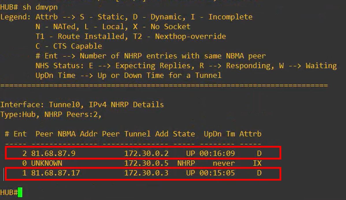 - On the HUB: two active peers, corresponding to the two Cisco spokes (connected and operational).