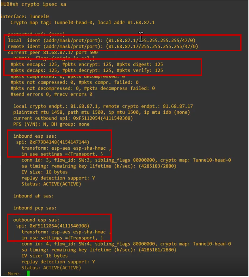To verify the operational status of IPsec tunnels on the routers, the command „show crypto ipsec sa“ is executed. This command provides detailed information about the active Security Associations (SAs) established between the HUB and its connected spokes.