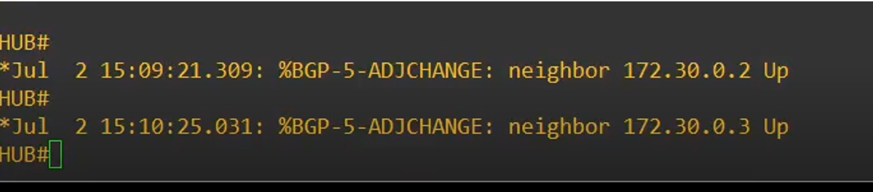 Upon activating the WAN interfaces, the BGP session comes up, for erxample we can see on the HUB:
