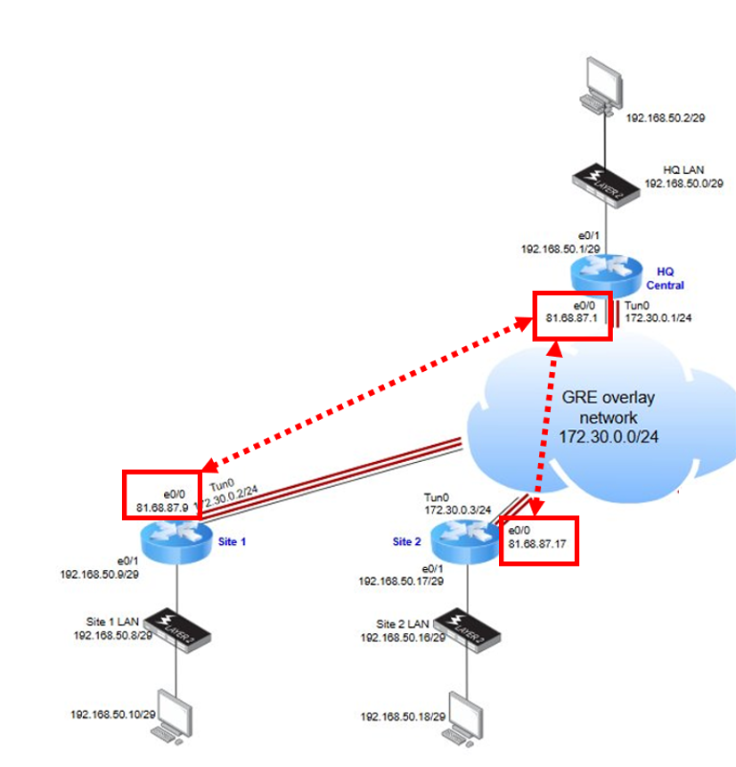 - Local: WAN IP address of the HUB / Spoke 1 / Spoke 2
