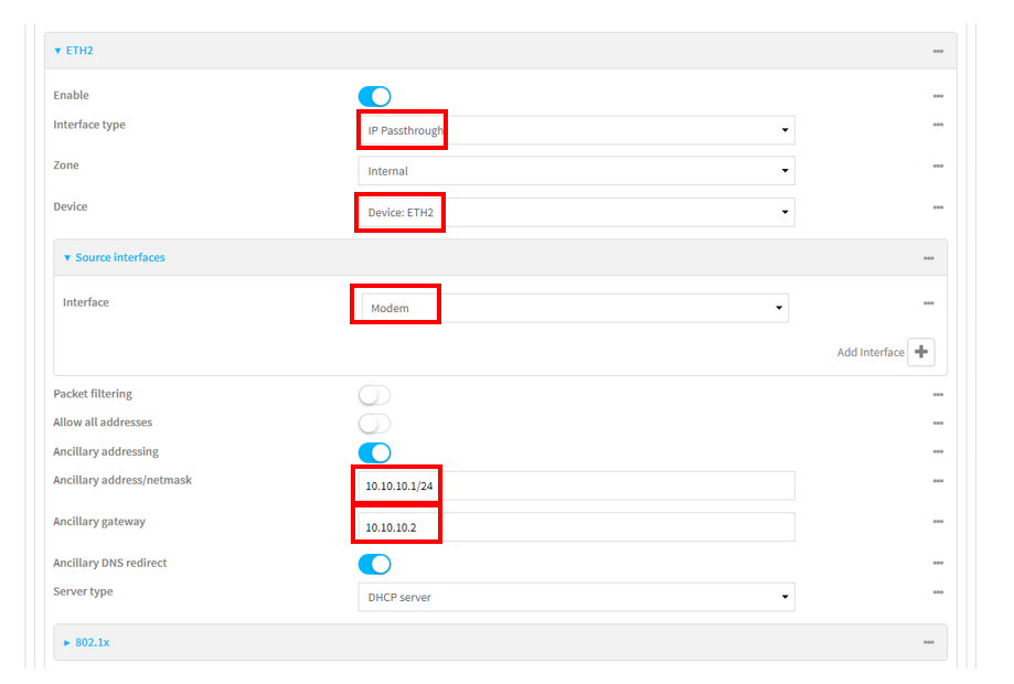 4) Change the ETH2/LAN type to be IP Passthrough, set the source interface as modem and configure an ancillary address/gateway: