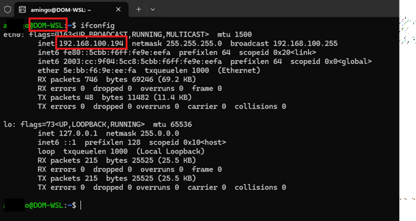 Restart the WSL instance again as before and verify the network configuration with ifconfig command: