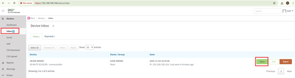 Once the enrollment script has fully loaded and executed, you should see a connection request appear in the "Inbox" section of the Digi OnPrem Manager server's Web UI, click on Allow to accept it: