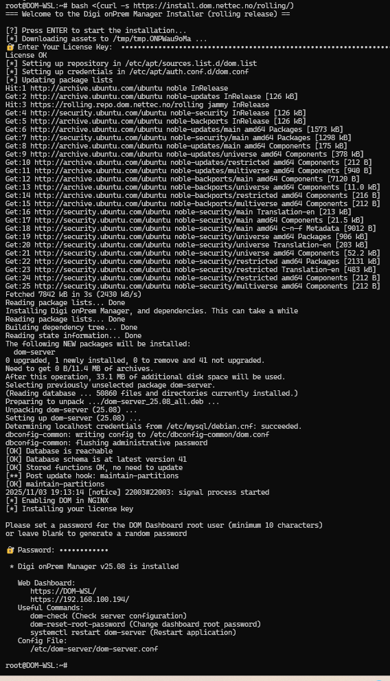 Windows Subsystem for Linux (WSL) allows you to run a full Linux environment directly on Windows without the need for a virtual machine. This guide walks you through installing Digi On Prem Manager (DOM) on an Ubuntu Server running inside WSL, with network bridging to make the server reachable on your LAN