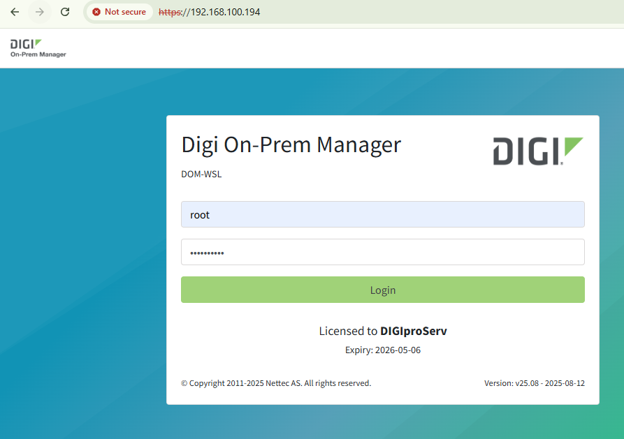 Open a browser and navigate to the Digi OnPrem Manager server using its hostname or IP address: