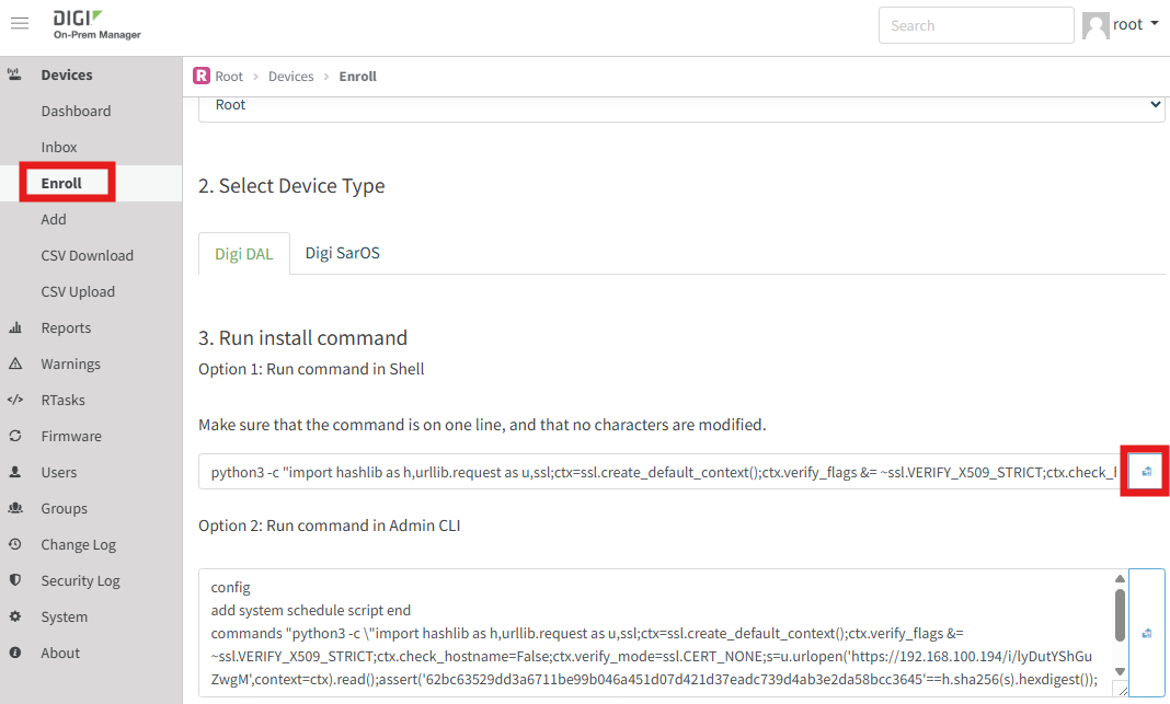 Navigate to the Enroll Section and copy the Shell Command for Enrollment: