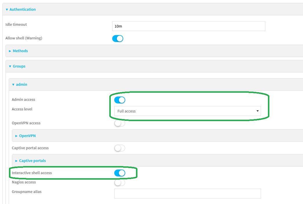 then select Authentication > Groups > admin > admin access: enabled with level: Full access and further below: